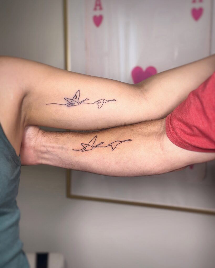 The simplicity of the design adds a timeless beauty, emphasizing the grace and unity in their relationship. This tattoo is a lovely reminder that no matter where life takes them, they will always soar together.