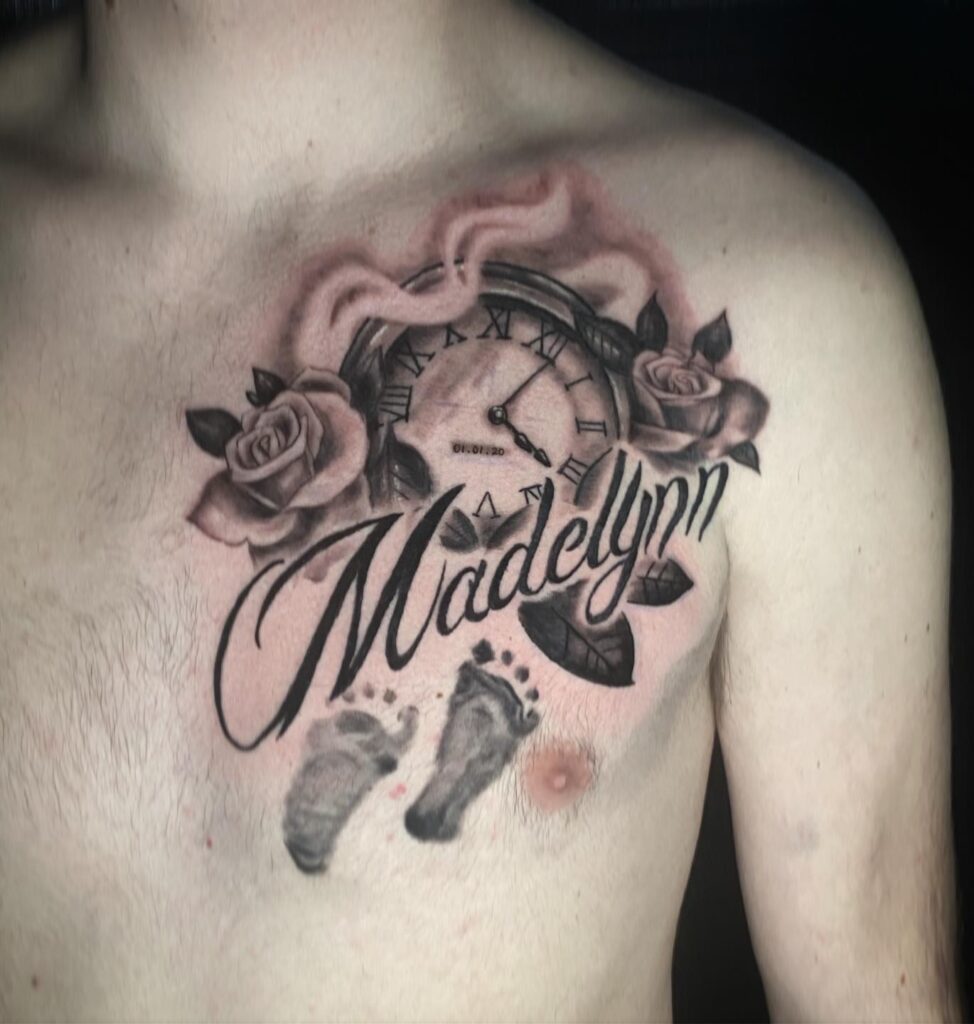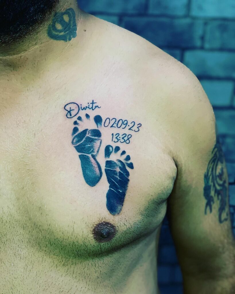 This heartfelt tattoo captures the precious moment of a daughter’s birth. Two tiny footprints are inked on the chest, symbolizing the first steps of a newborn. The name is elegantly scripted above the prints, alongside the birth date and time.