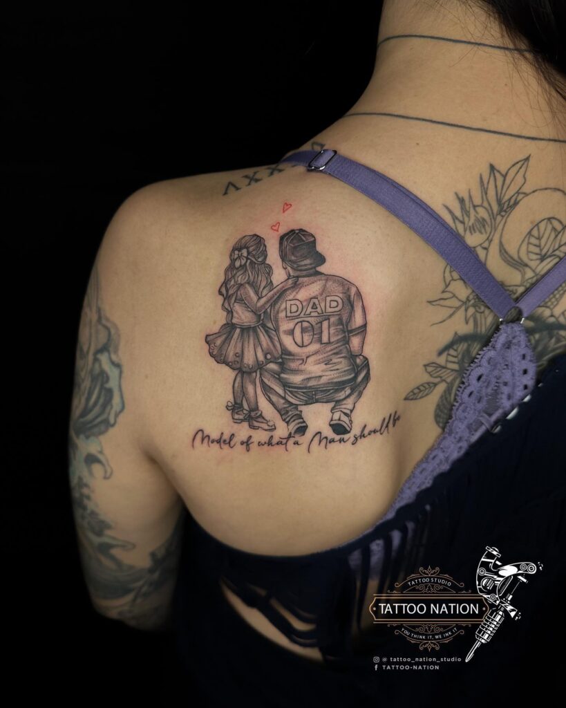 This touching tattoo depicts a father squatting down beside his daughter, showcasing a moment of deep connection and love. The father’s shirt is labeled “Dad 01,” while the daughter affectionately places her hand on his shoulder, symbolizing trust and admiration.