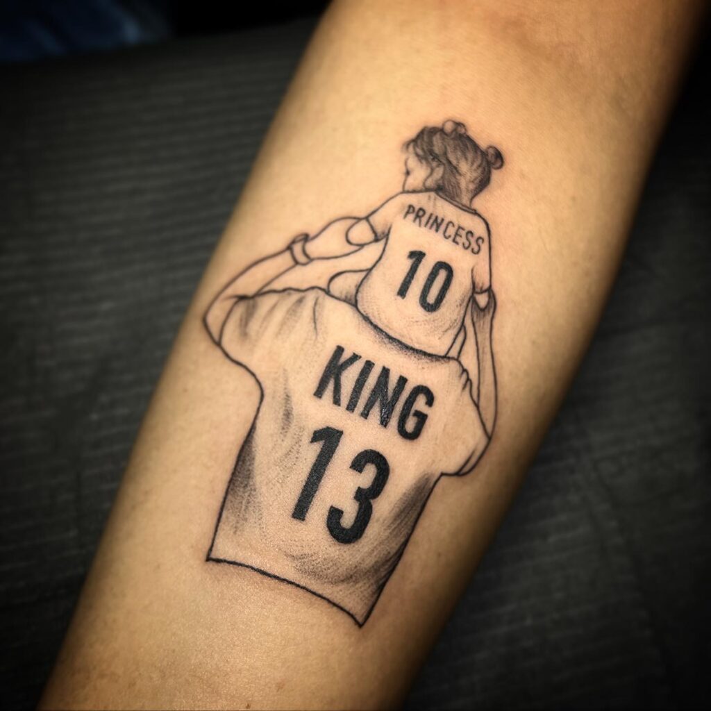 This heartwarming tattoo showcases a father and daughter in matching jerseys, labeled “King” and “Princess.” The daughter sits proudly on her father’s shoulders, symbolizing the strong bond and sense of protection that a father provides.