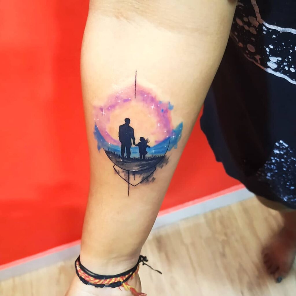 This tattoo portrays a touching scene of a father and daughter walking hand in hand beneath a vibrant, starry sky. The watercolor-style background with its soft hues of pink, purple, and blue creates a dreamy atmosphere, emphasizing the magical bond between the two.