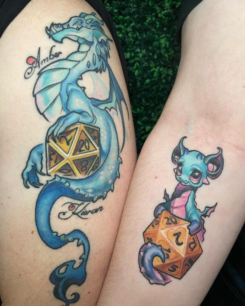 These vibrant matching tattoos feature a majestic blue dragon on the father’s arm, holding a detailed 20-sided dice, while the daughter’s tattoo showcases an adorable baby dragon with a similar dice. Names are incorporated into the designs, adding a personal touch.