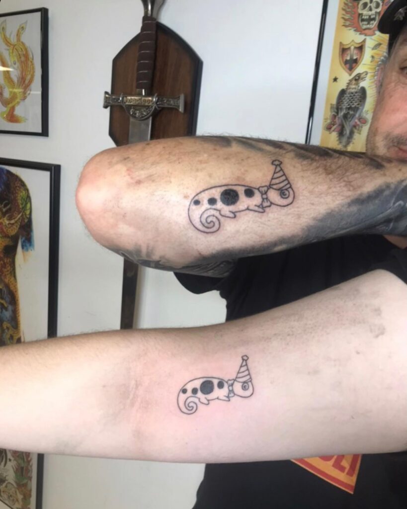 These playful matching tattoos feature a whimsical chameleon wearing a party hat, symbolizing the fun, quirky, and joyful relationship shared between a father and daughter. The simple yet charming design reflects their shared sense of humor and love for unique, lighthearted moments.
