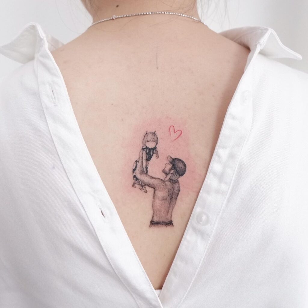 This heartwarming tattoo captures a tender moment between a father and his daughter, as he lifts her joyfully into the air. The delicate details in the design convey the love and happiness shared between them. The addition of a small red heart adds a touch of warmth and affection, emphasizing the deep bond they share.