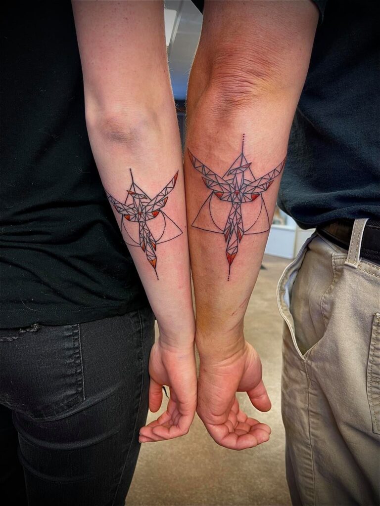 This creative and symbolic matching tattoo features a phoenix, representing rebirth and eternal life, combined with the iconic Harry Potter logo, all rendered in a unique sacred geometry style. The intricate geometric patterns add a modern and sophisticated touch, making the design visually striking. The use of subtle red accents in the design highlights the phoenix’s fiery nature, adding depth and warmth to the piece.