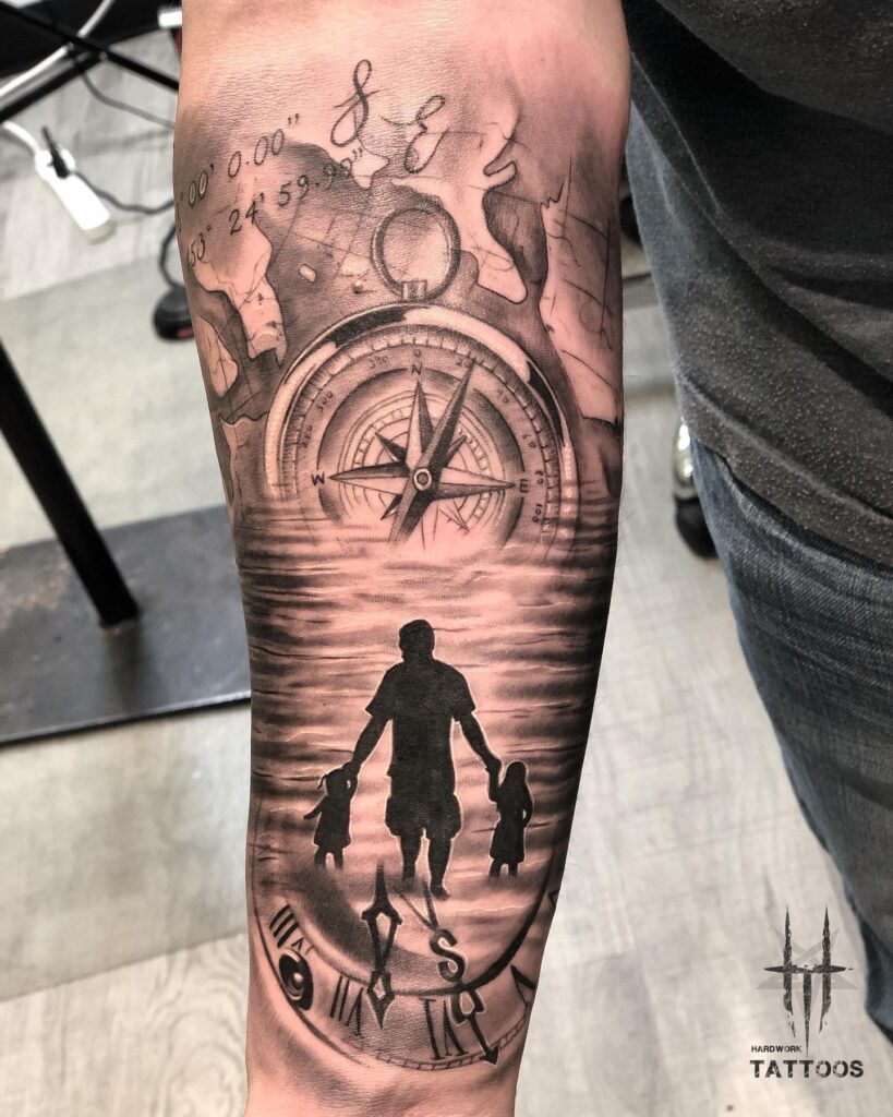 This tattoo beautifully captures the essence of a father guiding his daughters through life’s journey. The central figure, a father holding his daughters’ hands, is silhouetted against a compass, symbolizing direction, protection, and steadfast love.