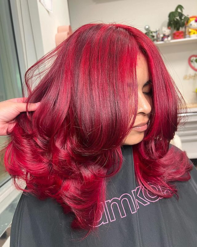 Bold Ruby with Shadow Roots combines vibrant ruby red color with darker roots, creating a striking contrast. The bright red color is eye-catching, while the shadows from the roots add depth and make the transition look natural and dramatic. This style is perfect for those looking for vibrant, eye-catching color that is easy to maintain at the roots for a chic and effortless look. He is bright, energetic and full of character.