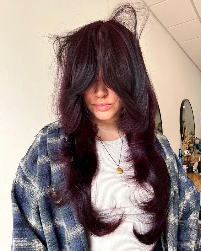 Dark Berry Layers combine deep, rich berry tones with layered cuts that add texture and dimension. Dark berry color looks bold and vibrant, and the layers add movement and depth to the hair, making the color pop even more. This look is perfect for those who want a rich, multi-dimensional shade full of life and personality, and the layers give it a casual cool vibe.