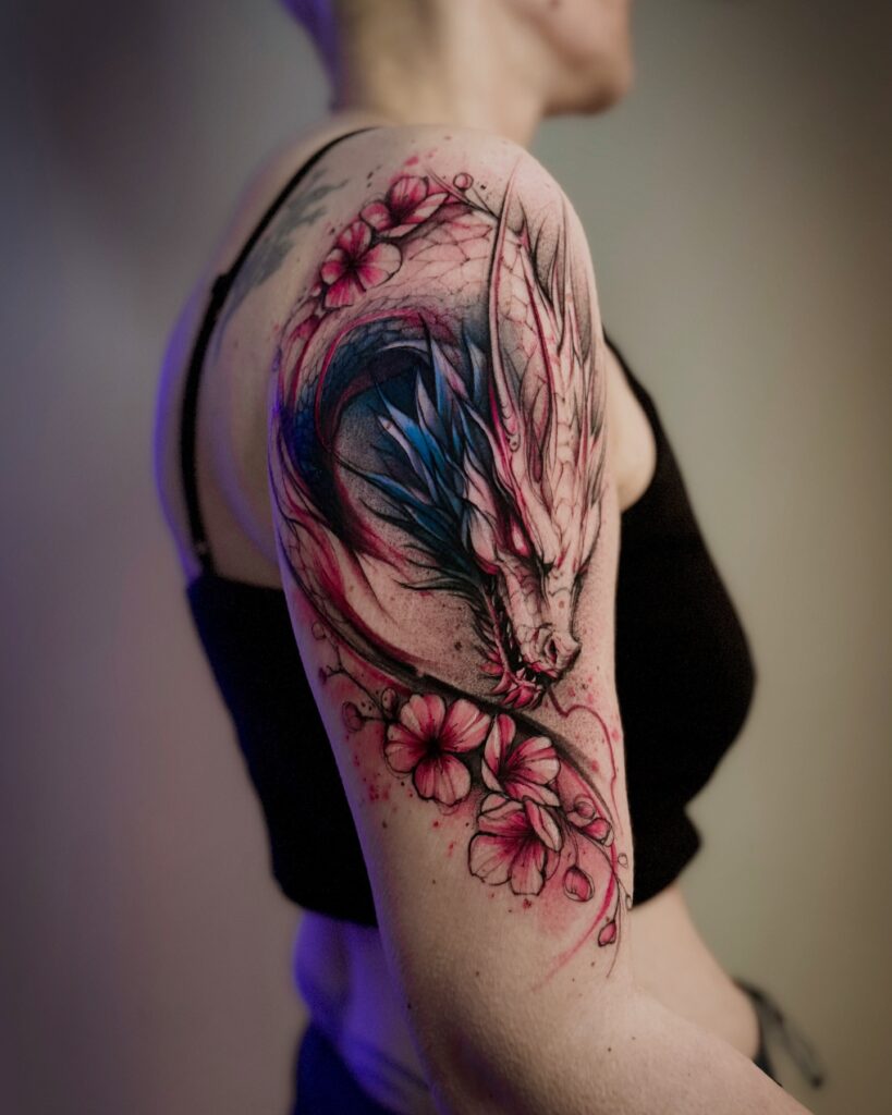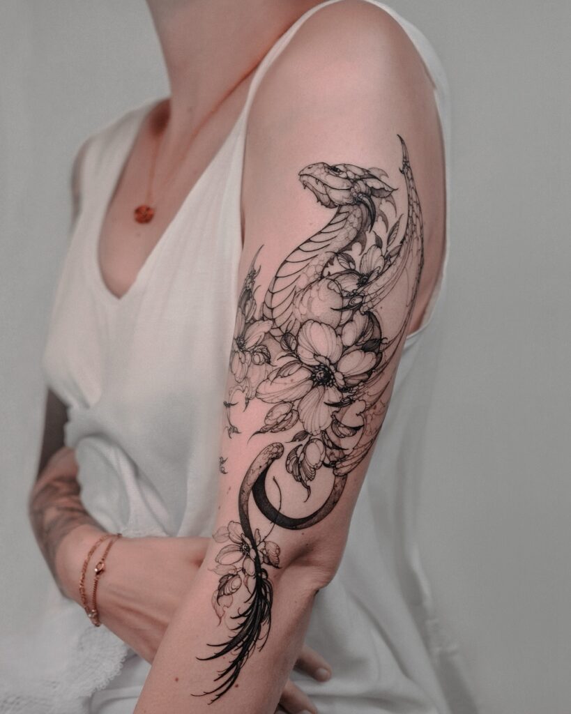 This tattoo blends a dragon with detailed flowers, wrapping gracefully around the upper arm for a soft yet powerful effect.