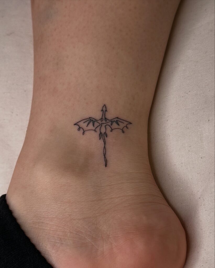 Placed delicately on the ankle, this tattoo features a thinly outlined dragon with wings spread wide. The minimal approach makes it versatile, fitting both casual and formal looks.