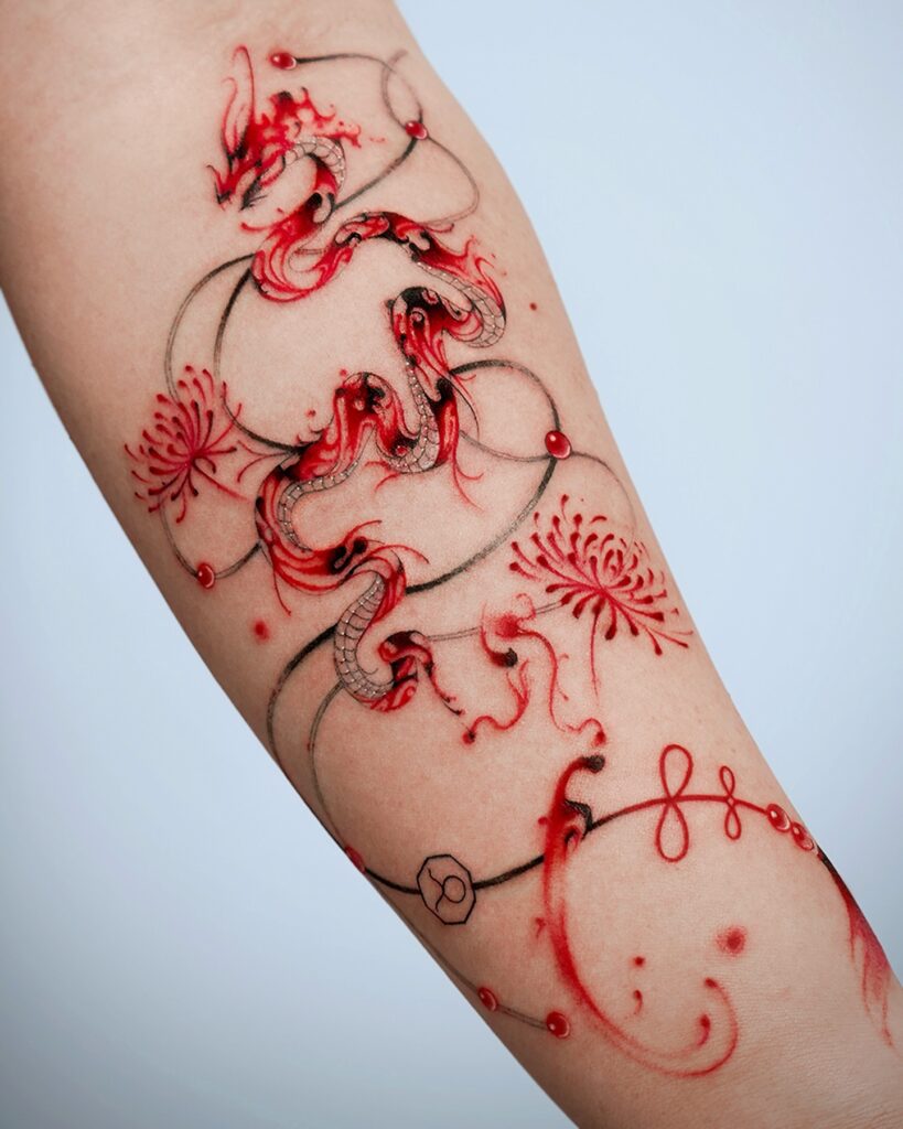 Drawn in bold red ink, this small dragon tattoo on the arm is striking yet minimal. The dragon’s wings stretch upward while its slender body trails downward with smooth flow.
