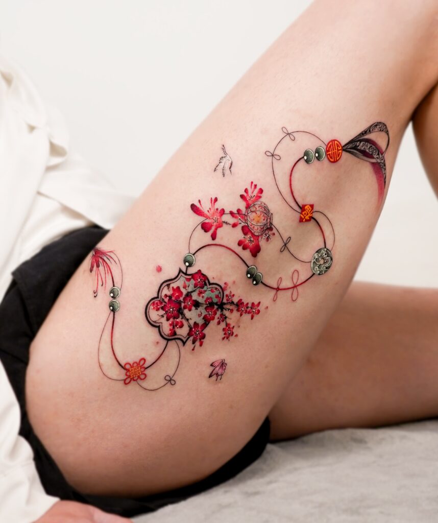 The placement on the thigh allows space for the long composition to extend vertically. The combination of soft blossoms and a mythical figure balances strength with delicacy, making this tattoo visually striking and refreshingly unique.