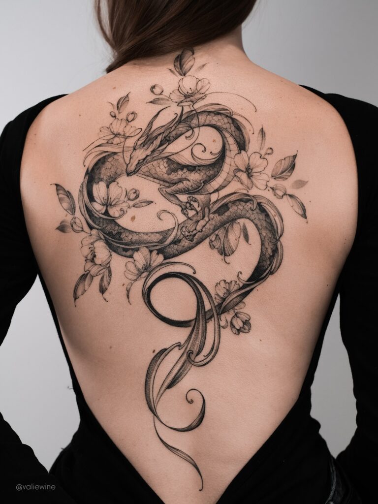 This tattoo features a coiled dragon surrounded by blooming flowers, flowing elegantly across the back with a balanced composition.
