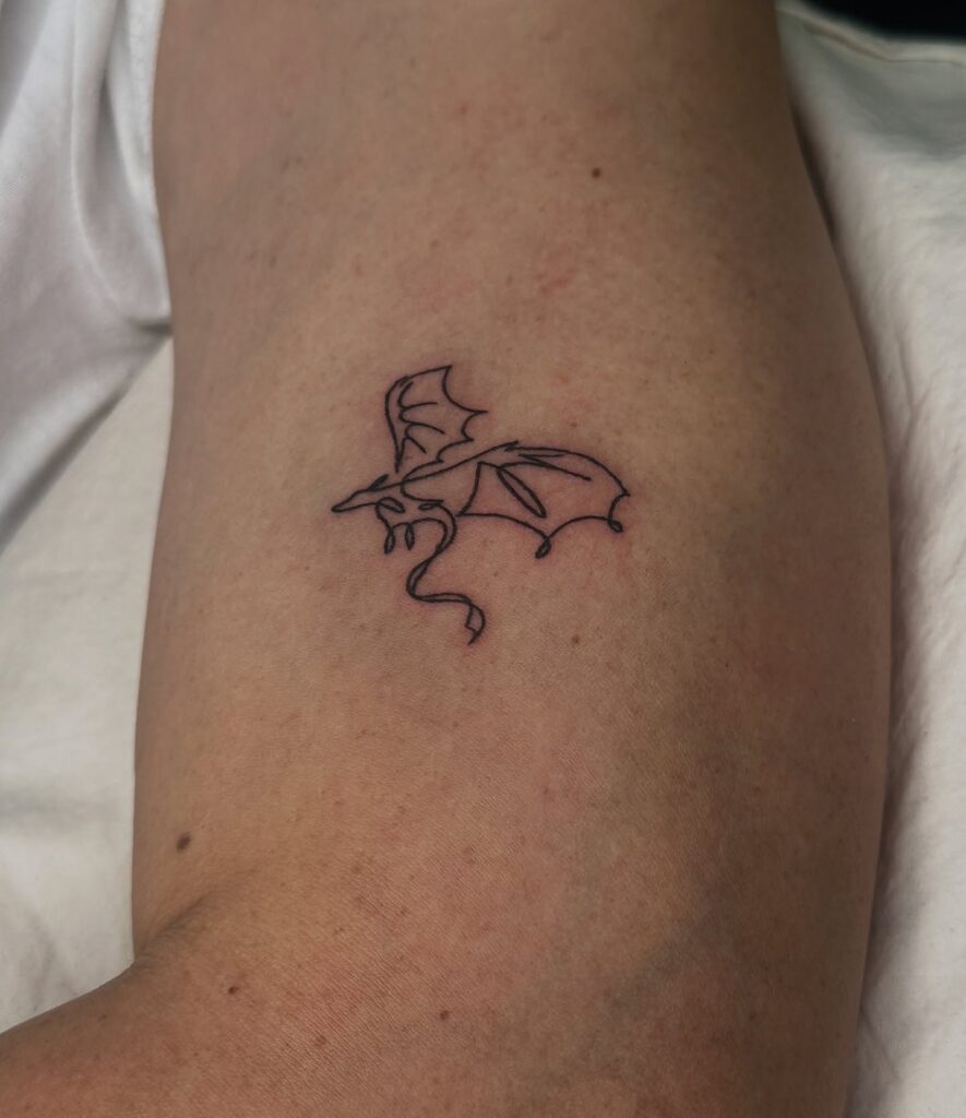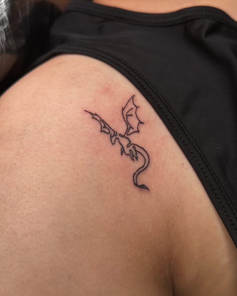 Placed on the shoulder, this fine-line dragon tattoo feels light and flowing. The wings are lifted as if ready to soar, while the tail curves softly for balance.