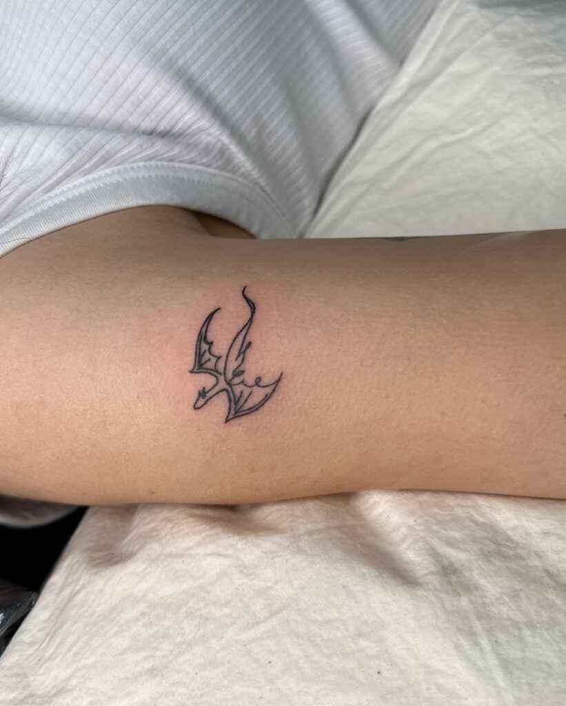 This tattoo shows a tiny dragon mid-flight, inked on the arm with simple black outlines.