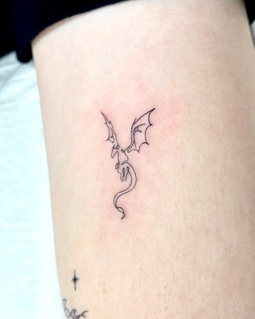 The dragon’s posture suggests flight, giving the design energy despite its size. The tail flows smoothly, adding elegance without cluttering the space. Being so minimal, it works well as a subtle everyday tattoo.