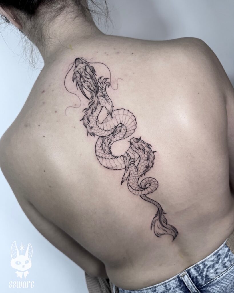 This tattoo features a dragon coiled gracefully along the spine, its body detailed with fine scales and flowing curves.