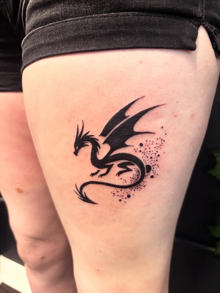 The placement on the thigh makes the dragon stand out while still offering balance with the natural shape of the leg. The clean lines and bold shading ensure this piece stays visually powerful and timeless.
