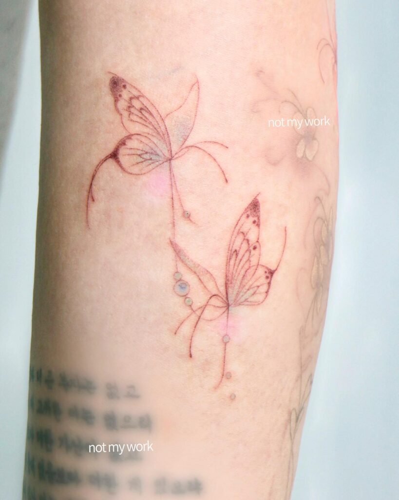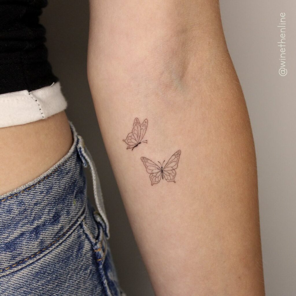 This tattoo features two graceful butterflies, drawn with clean and minimal fine line detailing.