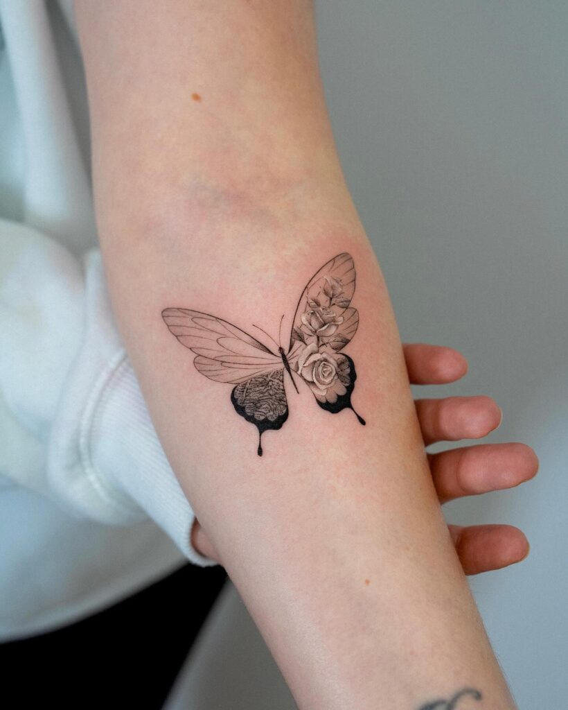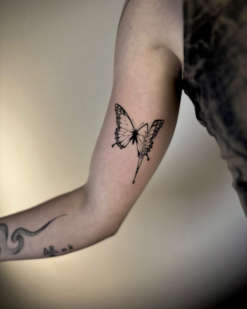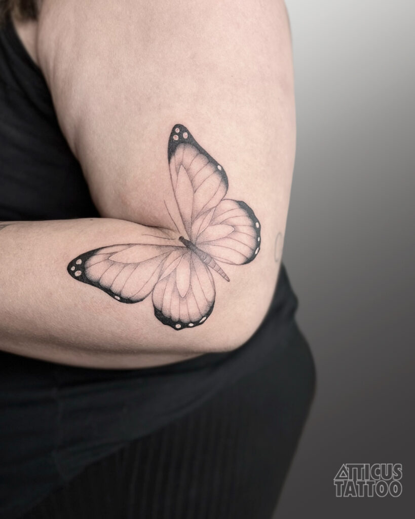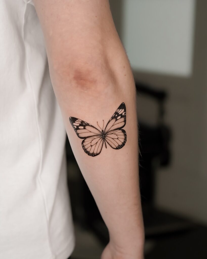 This tattoo features a butterfly positioned on the arm, crafted with soft shading and bold edges for striking contrast.