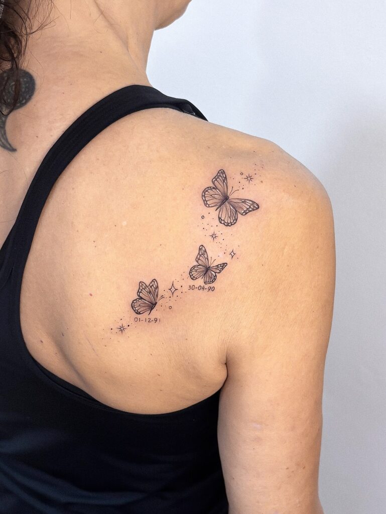 Each butterfly is finely detailed, with soft shading that gives depth and movement to the wings. Small star-like accents surround them, adding a dreamy celestial feel to the design. Below two of the butterflies, dates are inscribed, making the piece deeply personal and meaningful.