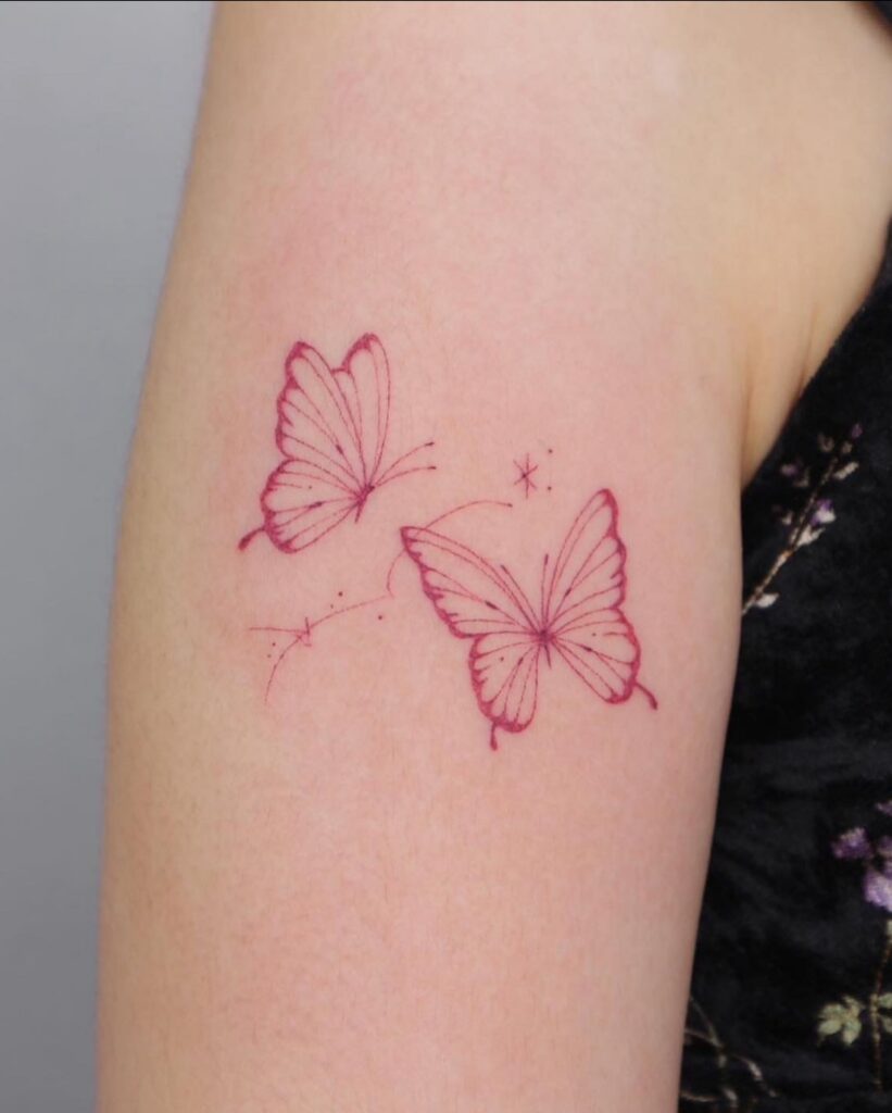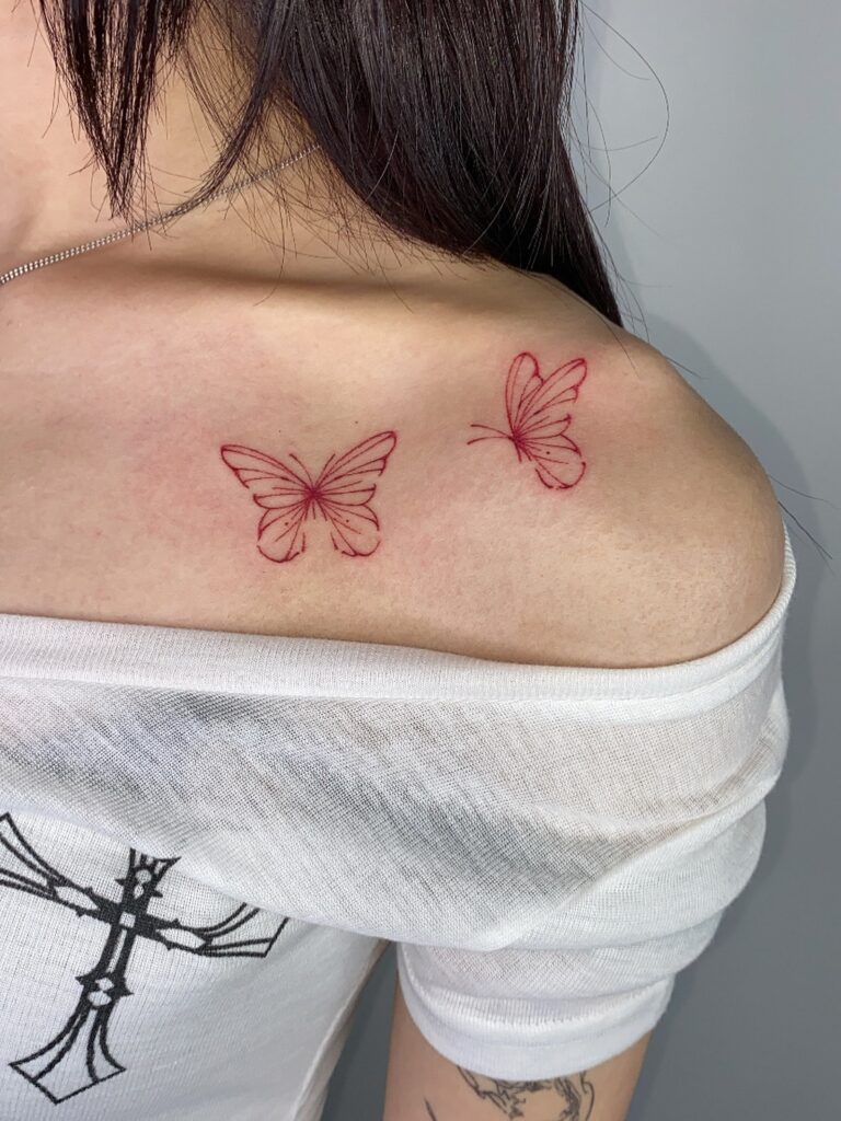 This tattoo displays two butterflies inked in fine red lines, delicately placed across the shoulder for a graceful effect.