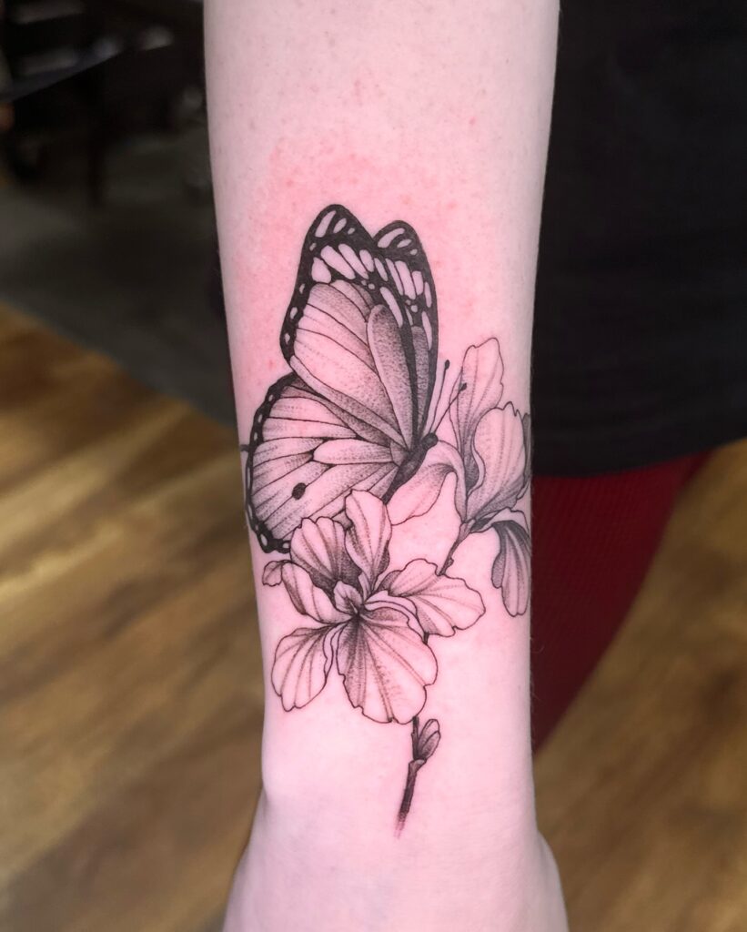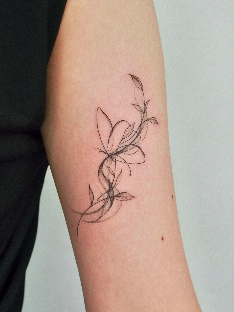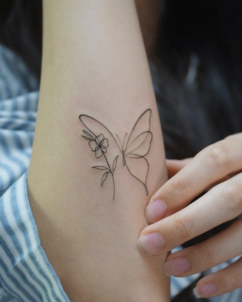 The simplicity of line work makes the piece timeless, while the pairing of butterfly and flower suggests beauty and growth. Placed on the arm, it feels personal yet refined, perfect for a subtle statement.
