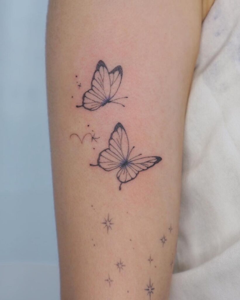 This tattoo displays two butterflies paired with small stars and sparkles, creating a dreamy and celestial design.