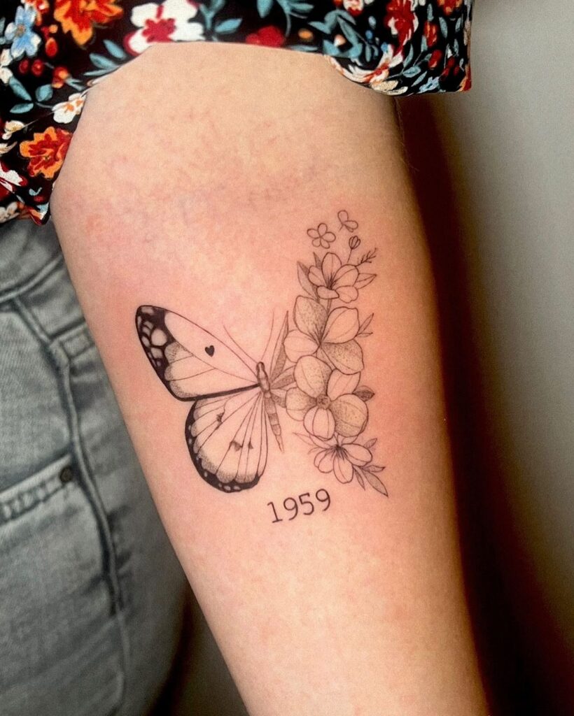 This tattoo blends a butterfly with a cluster of delicate flowers, enhanced by the addition of a meaningful date.