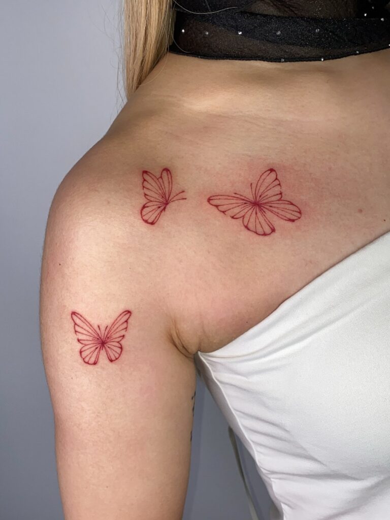 This tattoo features three butterflies delicately inked in bold red, positioned across the shoulder and upper arm.