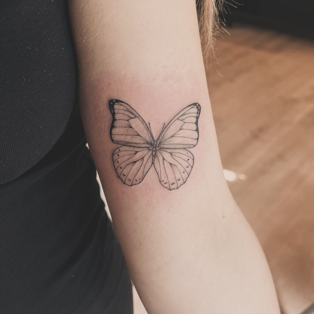 Its placement flows naturally with the arm’s curves, enhancing visibility and elegance. This design blends fine line artistry with shading depth, making it perfect for those who want a realistic yet graceful butterfly tattoo.