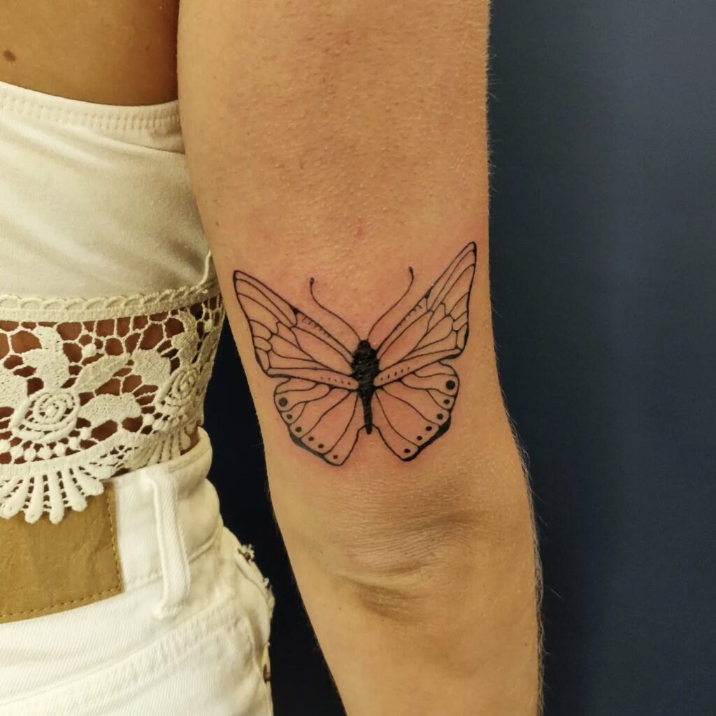 This tattoo showcases a single butterfly delicately placed on the back of the arm, just above the elbow.
