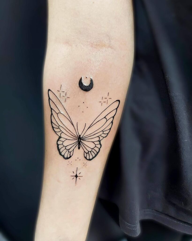 This tattoo blends elegance and mysticism, featuring a detailed butterfly framed by celestial accents.