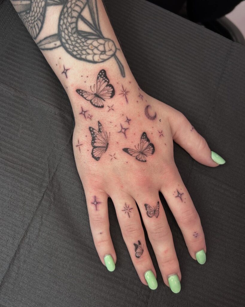 This enchanting tattoo features several delicate butterflies gracefully placed across the hand and fingers, surrounded by sparkling star accents.