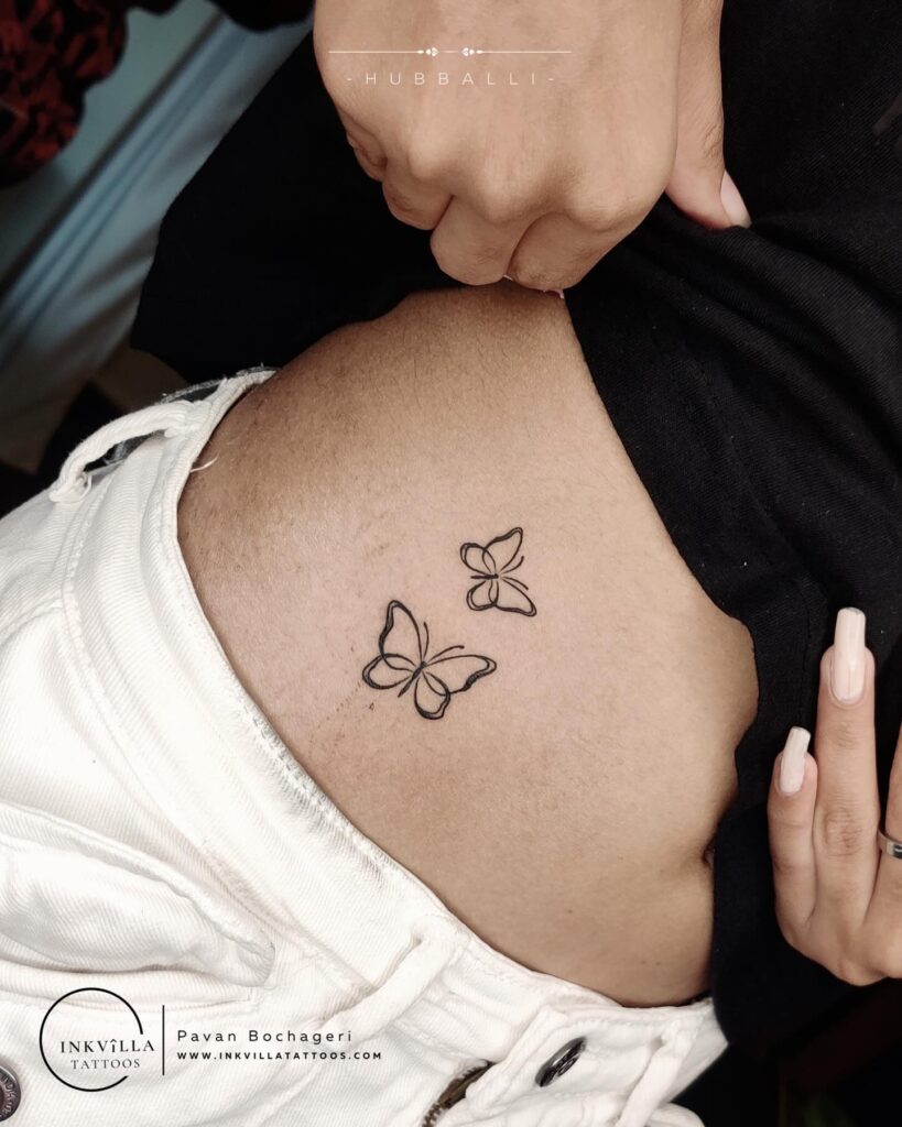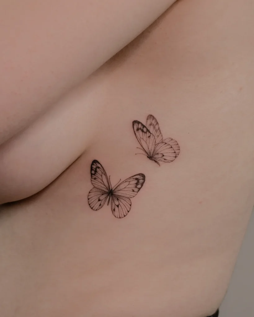 This tattoo showcases two butterflies placed delicately along the rib, creating a graceful and natural flow.
