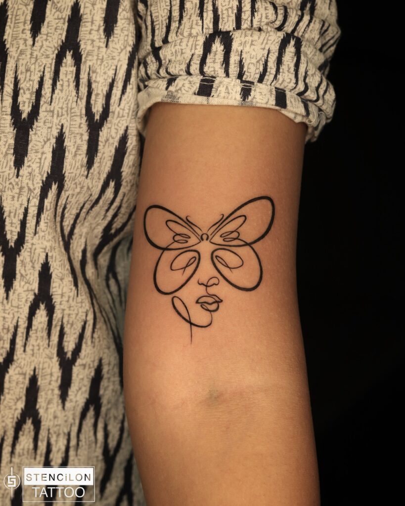 This creative tattoo merges the elegance of a butterfly with the outline of a human face in a continuous line style.