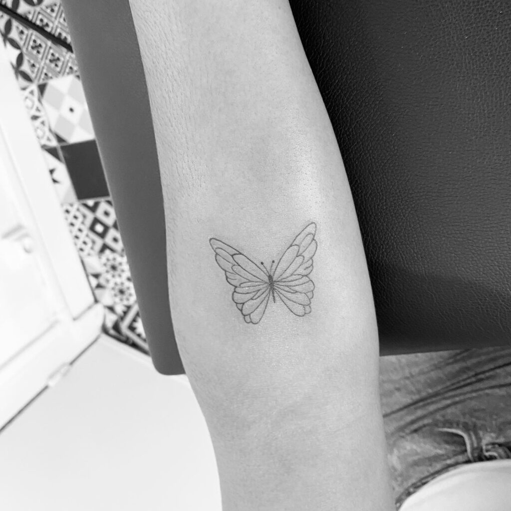 This tattoo showcases a small butterfly placed delicately on the inner arm, drawn with precise fine line detailing.