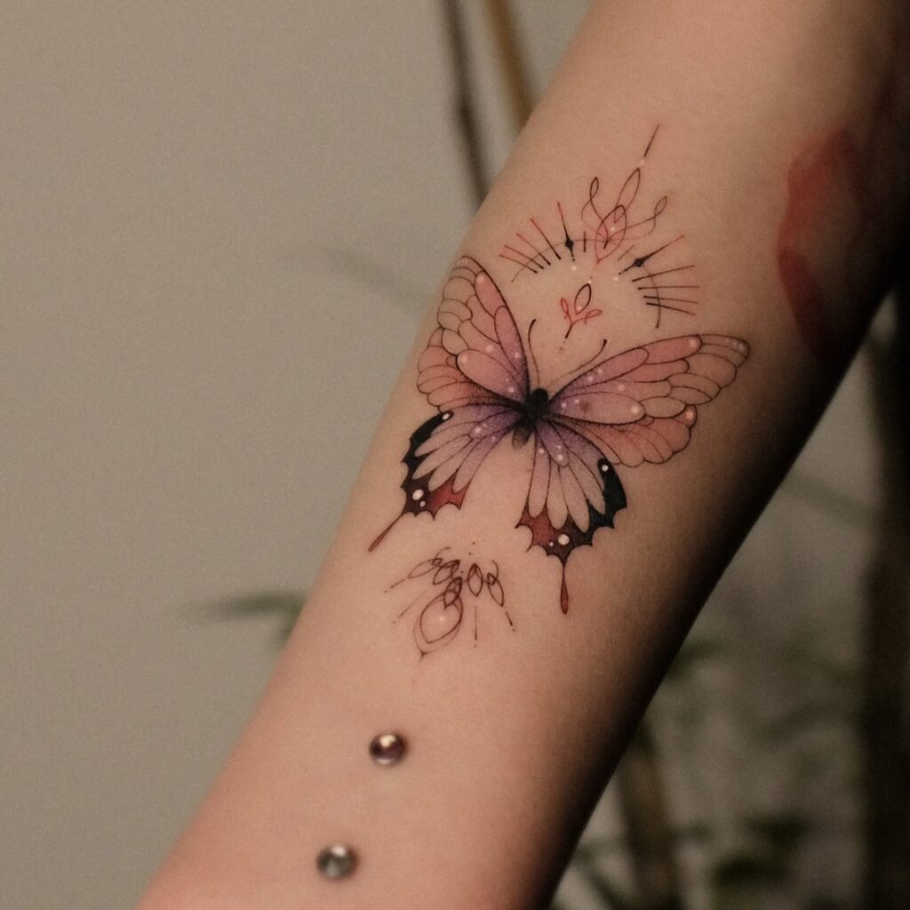 This tattoo features a butterfly enhanced with small star-like accents, adding a magical and dreamy effect to the design.