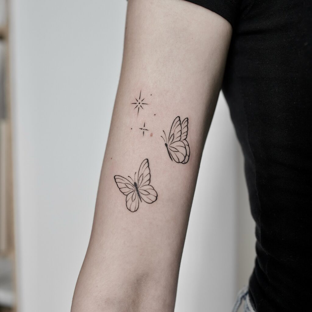 This tattoo features two butterflies delicately placed on the arm, accompanied by small star accents for a celestial touch.