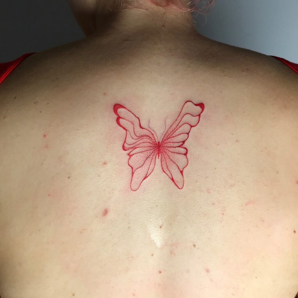 This tattoo features a butterfly created entirely with red fine lines, placed prominently in the center of the back.