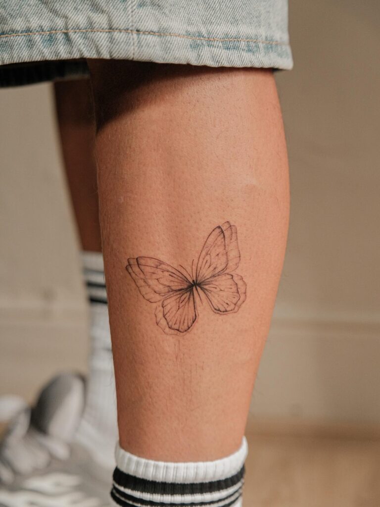 This tattoo captures a butterfly in mid-flight, placed gracefully on the leg for a natural flowing effect.