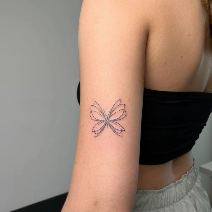 This tattoo showcases a finely detailed butterfly positioned on the upper arm, with delicate lines creating lifelike wing patterns.