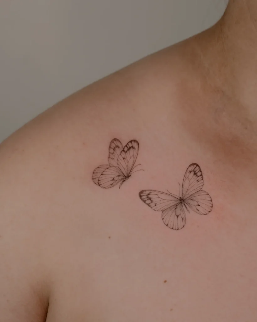 This tattoo displays two butterflies gently placed along the collarbone, creating a soft and elegant composition.