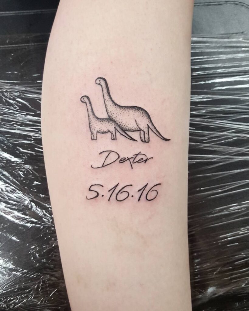 9. Mother and Baby Dinosaur Tattoo with Name and Date