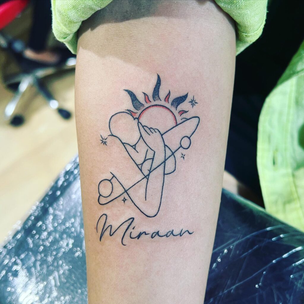 The name adds a personal touch, making the tattoo even more meaningful. The combination of cosmic symbols and the intimate embrace creates a stunning portrayal of the eternal bond between mother and son, signifying both love and protection across the universe.