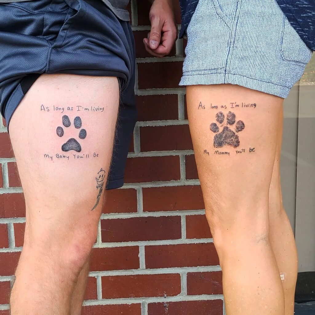 These mother-son matching tattoos feature a paw print and the heartfelt phrases “As long as I’m living, my Mommy you’ll be” and “As long as I’m living, my Baby you’ll be.” The paw print adds a unique and playful element, while the meaningful quotes emphasize the eternal bond between mother and son.