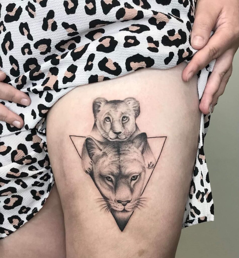 The triangular geometric frame adds a modern and artistic touch, emphasizing the balance and connection between the two. Positioned on the thigh, this tattoo is a bold yet elegant tribute to the fierce and loving relationship shared between mother and child.