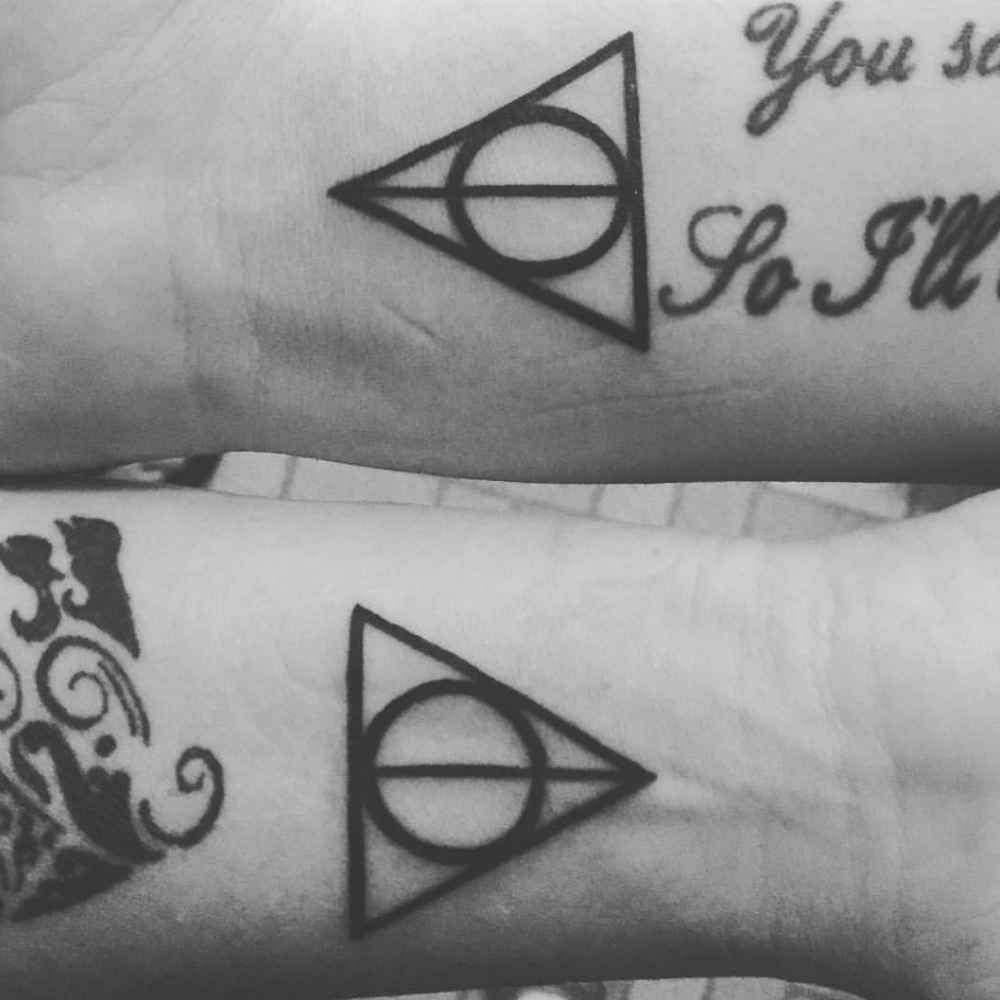 These matching tattoos feature the iconic Deathly Hallows symbol from the Harry Potter series. The symbol consists of three elements: a triangle, a circle, and a line. The triangle represents the Invisibility Cloak, the circle symbolizes the Resurrection Stone, and the line stands for the Elder Wand. Together, these elements signify the quest for mastery over death.