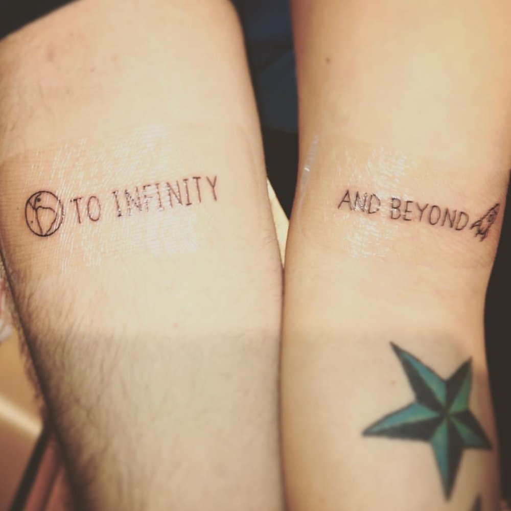 This is another tattoo idea featuring the iconic phrase “To infinity and beyond” from the beloved Toy Story series. The phrase is split between mother and son, symbolizing their limitless bond and shared adventures.