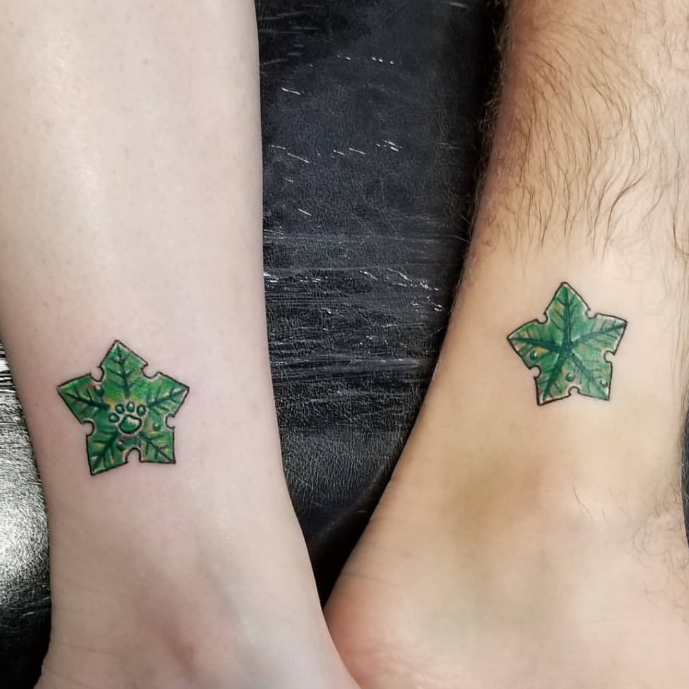 This tattoo features a green leaf shaped like a star with a central paw print, creating a unique and playful design. The matching tattoos symbolize a shared love for nature and animals, particularly the bond between a mother and son. The leaf represents growth, life, and renewal, while the paw print signifies a deep connection to pets or wildlife.